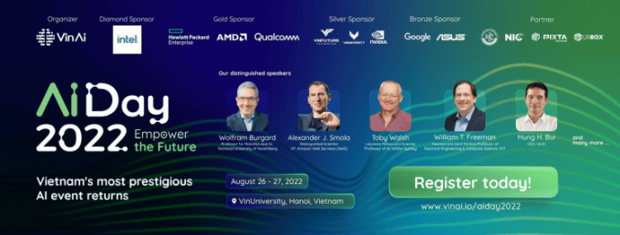Diễn giả của AI Day 2022 là những nhà khoa học tiên phong đến từ các viện nghiên cứu, trường đại học và doanh nghiệp hàng đầu thế giới về AI, với những tên tuổi đầu ngành như: Giáo sư Wolfram Burgard (Khoa Robot và Trí tuệ nhân tạo, Đại học kỹ thuật Nuremberg, Đức), Giáo sư Alexander J. Smola (Phó Chủ tịch Amazon Web Services - AWS), Giáo sư William T. Freeman (Khoa Kỹ thuật điện & Khoa học máy tính, Viện Công nghệ Massachusetts – MIT, Mỹ), Giáo sư Toby Walsh (Khoa Trí tuệ nhân tạo, Trường Đại học New South Wales Sydney, Australia), Giáo sư Tiến sĩ Bùi Hải Hưng (Tổng giám đốc VinAI), Tiến sĩ Nguyễn Văn Dương (Trưởng Bộ phận Hệ thống Hỗ trợ lái xe ADAS của Panasonic Automotive Europe), Giáo sư Inderjit S. Dhillon (Khoa Toán và Khoa học máy tính, Trường Đại học Texas, Austin, Mỹ)...